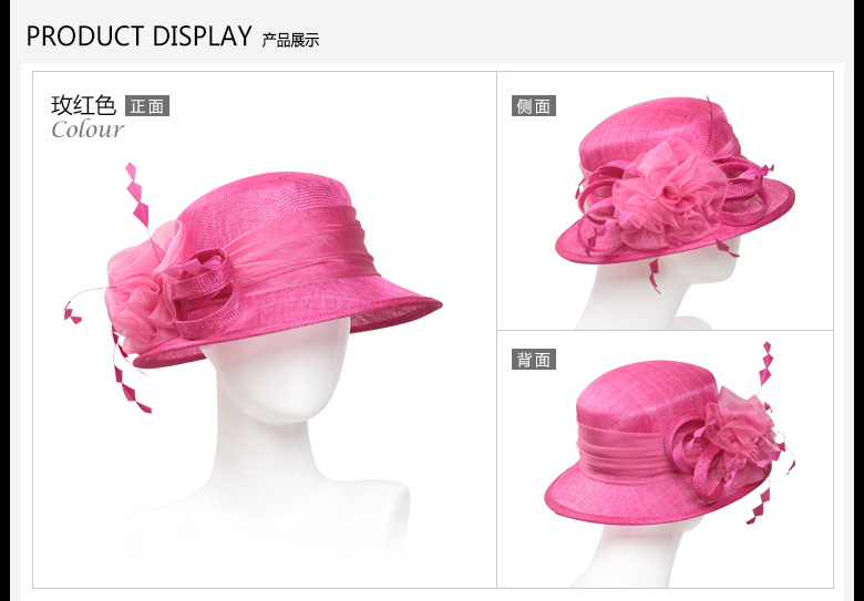 帽子的帽花部分別出心裁的采用輕軟的薄紗褶皺式設(shè)計(jì),大膽而不張揚(yáng)。給帽子增添了些許靈動(dòng)感和嬌媚,優(yōu)雅風(fēng)范彰顯無(wú)疑。