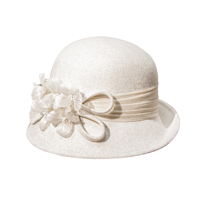 秋冬新款羊毛氈帽盆帽赫本風女純色百搭優(yōu)雅珍珠麻紗裝飾帶