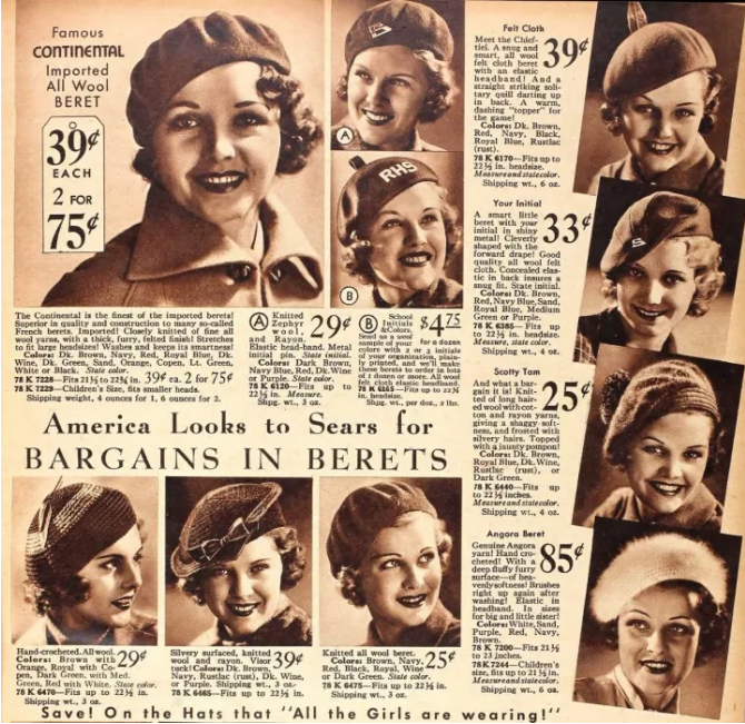 在20世紀(jì)30年代貝雷帽的流行到達(dá)了頂峰,那個(gè)時(shí)候電影里雜志上街上,到處都是佩戴貝雷帽的女人。1940年帶,貝雷帽更是變得更加多樣化,人們開始在貝雷帽上加羽毛,加蕾絲,加寶石等等……