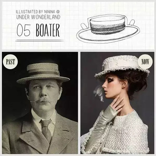 植物纖維編成的草帽,有著透氣涼爽的特性,因此在十九世紀(jì)初的休閑社交場合里大量的出現(xiàn)。平頂草帽的外觀給人紳士又可愛的感覺,扁扁方方的,但又圓圓的很工整。當(dāng)時(shí)許多寄宿男校也采用這種帽子作為夏日的制服帽。電影看多了都知道,那個(gè)時(shí)代的人很愛在草坪上野餐,所以這種帽子常變成男孩在草坪上扔擲的飛盤,好不青春,好不洋溢啊。